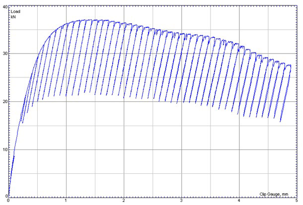 The program provides full machine control and analysis software to calculate JIc to meet requirements of ASTM E 1820, E 1737, E1152, E813, and BS 7448 Part 4. Under crosshead control, the specimen is loaded within rates stated in the standards; load, crosshead position and clip gauge readings are recorded. The original crack length, a0, is estimated from unloading compliance measurements and repeated until the last three values are within 0.2%W. The test is continued with the load/unload sequences to produce J versus crack extension data points evenly spaced over the user prescribed test region.