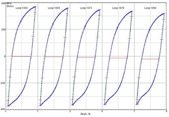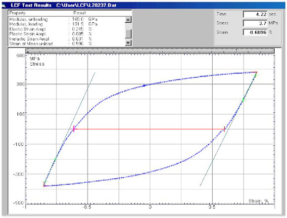 The program reads either hysteresis loop data or the summary data, cycles vs. max. and min. load and strain data or both; draws a plot of stress vs. no of cycles. After a few cycles, the stress-strain path generally becomes stable. A percentage stress decrease defines the ‘failure cycle count’, Nv. The specific variables determining specimen life can be calculated directly from the 0.5Nv hysteresis loop. The loading and unloading modulus, the plastic and elastic strain portions, max. and min. strain, mean and amplitude strain, max. and min. stress, mean and amplitude stress are calculated.